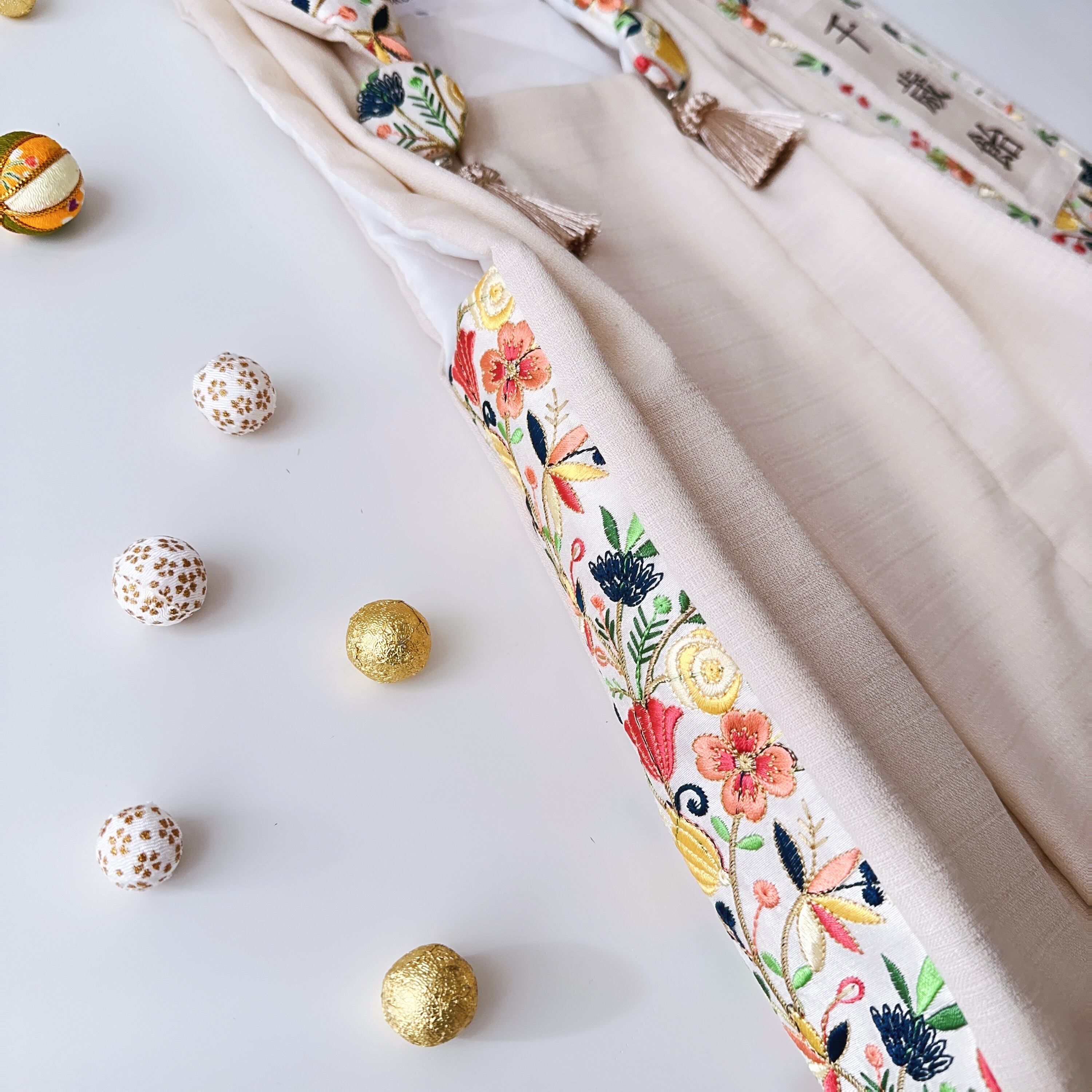 脇まちと衿と被布飾りに刺繍リボンを使った華やかなデザインが、お子様の晴れの日を彩ります。